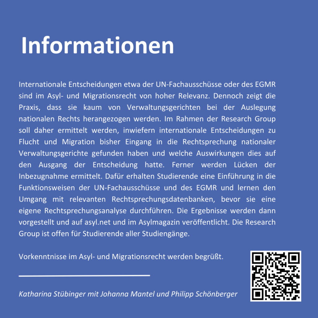 Trotz der hohen Relevanz und der rechtlichen Verpflichtung zur Berücksichtigung zeigt die Praxis, dass internationale Entscheidungen etwa der UN-Fachausschüsse oder des EGMR kaum von nationalen Verwaltungsgerichten bei der Auslegung nationalen Rechts herangezogen werden. Vor diesem Hintergrund weisen wir auf das forschungsbasierte Seminar „UN-Sichtbar? Internationale Entscheidungen im Migrationsrecht in der nationalen Rechtsprechung“ im kommenden Sommersemester 2025 hin.