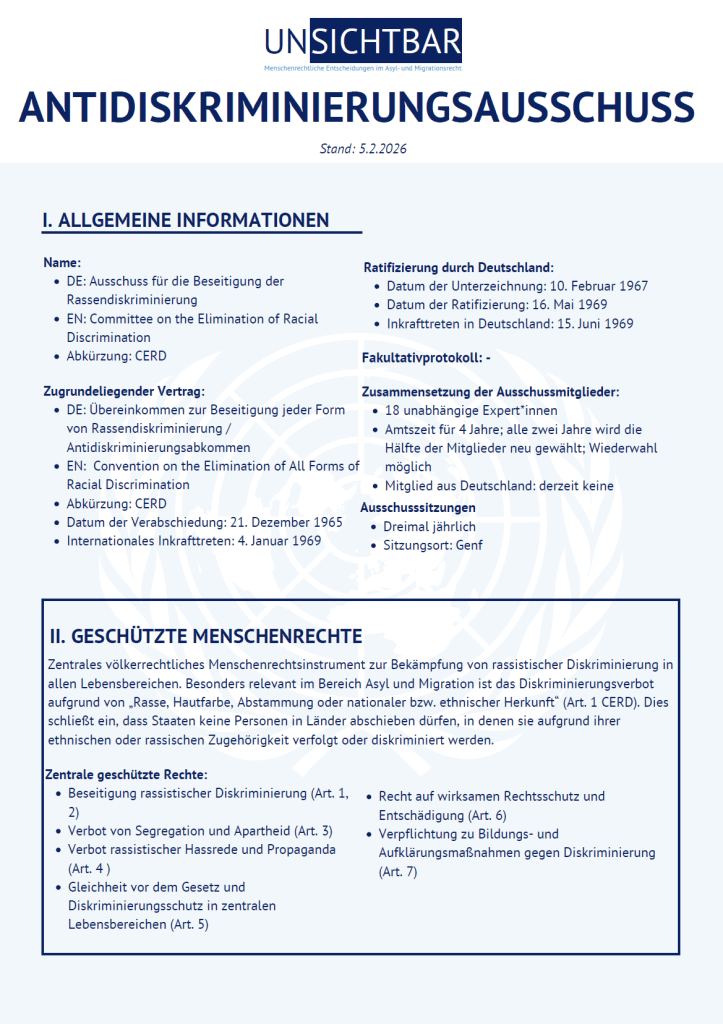Das folgende Dokument zeigt eine Übersicht über die verschiedenen UN-Spruchkörper: den Antidiskriminierungsausschuss, den Sozialrechtsausschuss, den Menschenrechtsausschuss, den Frauenrechtsausschuss, den Antifolterausschuss, den Kinderrechtsausschuss, den Wanderarbeitnehmerausschuss und den Behindertenrechtsausschuss.