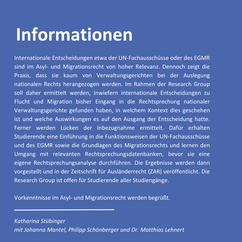 Im Bereich des Asyl- und Migrationsrechts spielen internationale Entscheidungen etwa des Europäischen Gerichtshofs für Menschenrechte (EGMR) und der durch Menschenrechtsabkommen etablierten UN-Fachausschüsse eine wichtige Rolle. Im deutschsprachigen Raum wird tatsächlich aber nur selten oder oberflächlich auf diese Entscheidungen Bezug genommen. Wir gehen davon aus, dass diese mangelnde Rezeption an fehlender, leicht zugänglicher deutschsprachiger Information zu den Entscheidungen und Wirkungsweisen dieser internationalen Menschenrechtsinstitutionen liegt. Das Projekt UN-Sichtbar? Internationale Entscheidungen im Asyl- und Migrationsrecht zielt darauf ab, diese Informationslücke zu schließen.